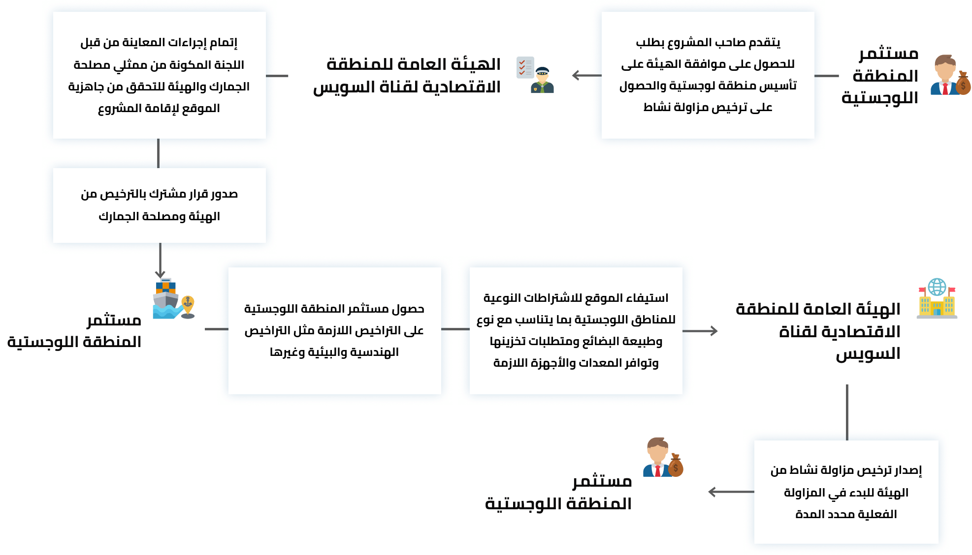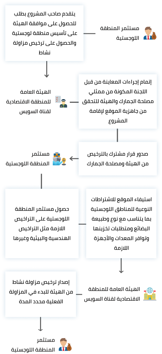 تنطبق هذه الإجراءات على المشروعات بالمنطقة وموظفيها أو وكلائها المفوضين بصحة توقيع بنكي لصالح المشروع لإنهاء الإجراءات الخاصة باستخراج ترخيص منطقة لوجستية استثمارية. يتم توفير كافة المعلومات الخاصة بهذه العملية والإجراءات اللازمة لها لتقوم المشروعات بالامتثال لها عند التقديم للحصول على الموافقة على تأسيس المنطقة اللوجستية بالمنطقة.