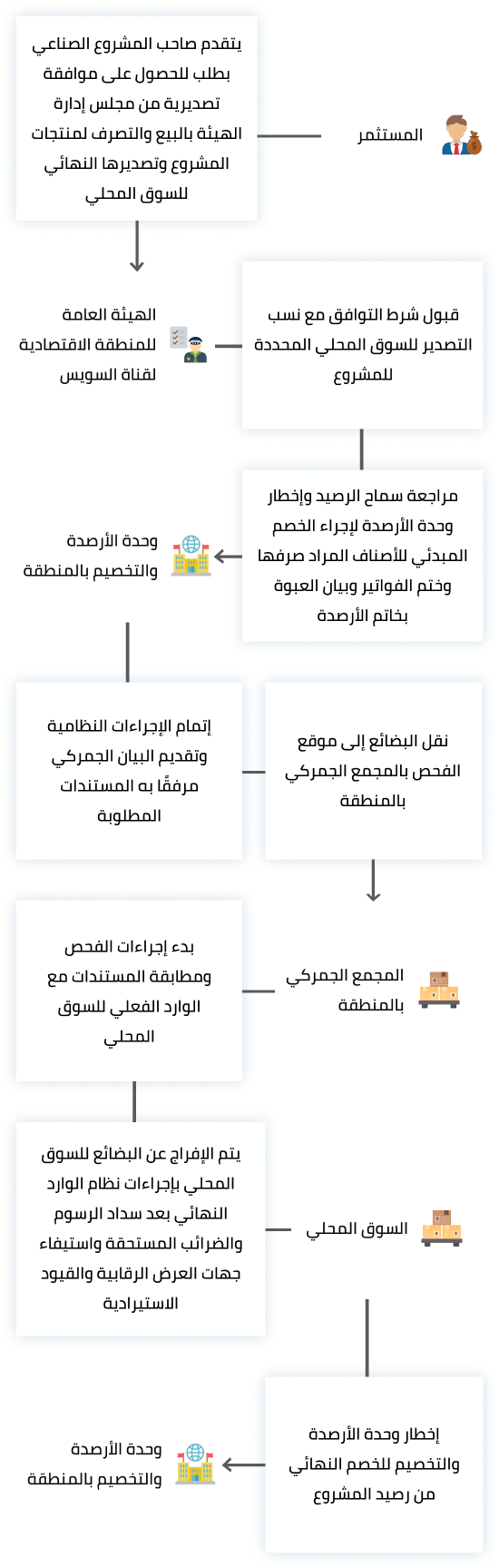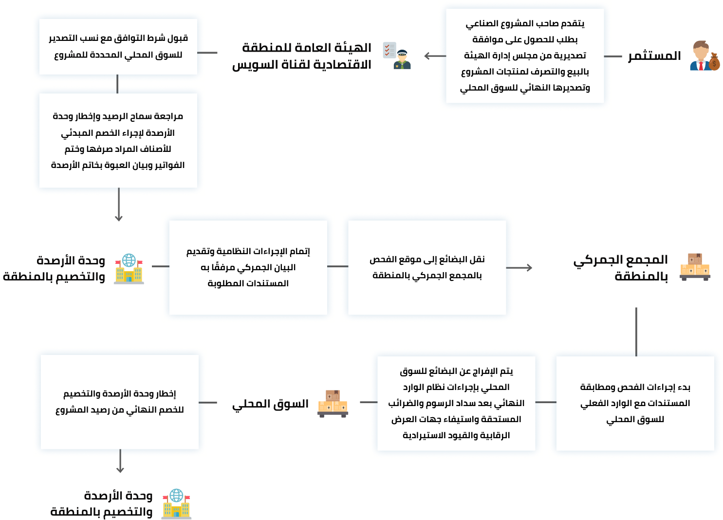 تنطبق هذه الإجراءات على المشروعات الصناعية بالمنطقة وموظفيها أو وكلائها المفوضين بصحة توقيع بنكي لصالح المشروع لإنهاء الإجراءات الخاصة بتصدير منتجات المشروع للسوق المحلي. يتم توفير كافة المعلومات الخاصة بهذه العملية والإجراءات اللازمة لها لتقوم المشروعات بالامتثال لها عند التقديم للحصول على الموافقات التصديرية للسوق المحلي. يتم نقل البضائع الواردة إلى السوق المحلي برسم الوارد النهائي من المناطق الاقتصادية.
